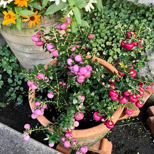 初めて見た姿、まさかついに果物系も入ってくるようになったのか?!、と調べると「ハッピーベリー」というツツジ科の観賞用の植物でした。