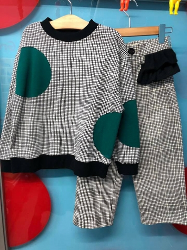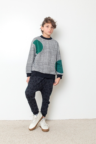 同柄のトップスとパンツで、