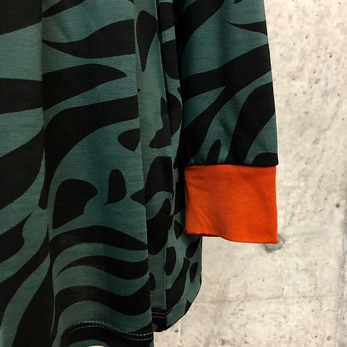 波の柄と襟ぐりの切り替え、袖口の配色が個性的なデザイン★彡